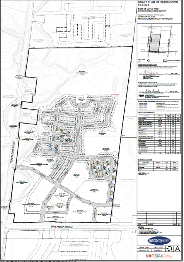 A development application has been submitted to amend the Town of Milton Zoning By-law to facilitate a Plan of Subdivision consisting of 396 single detached dwellings (Lots 1-396), 155 street townhouse units (Blocks 397-426), two Medium Density Residential II blocks (Blocks 427, 428), one Medium Density Mixed Use blocks (Block 429), three Neighbourhood Centre Mixed Use II blocks (Blocks 430-432), one elementary school (Block 433), one Park Type 2 block (Block 434), two village squares (Blocks 435, 436), three Natural Heritage System (NHS) blocks (Blocks 438- 440), and one stormwater management pond (Block 441), all connected via a series of public roads. Access to the development is provided from Trafalgar Road and Britannia Road. An additional connection to properties east of the subject lands is proposed as per the Trafalgar Secondary Plan.