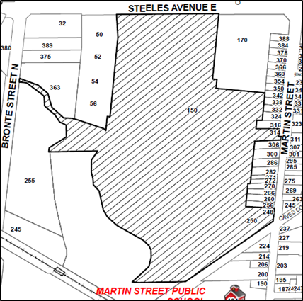 - The subject lands include four properties bound by Steeles Avenue East, the Sixteen Mile Creek valley, the old CP Railway line and existing residential properties fronting onto Martin Street. The subject lands comprise an area of 20.8 hectares (51.40 acres).